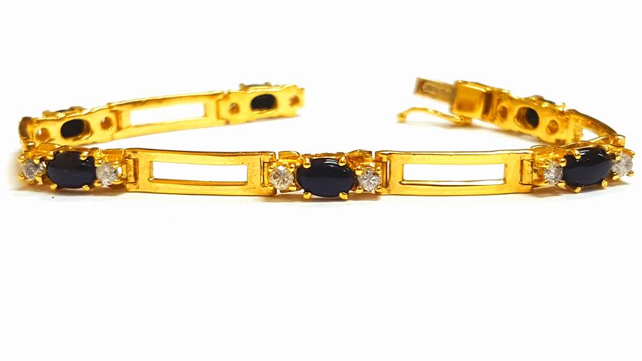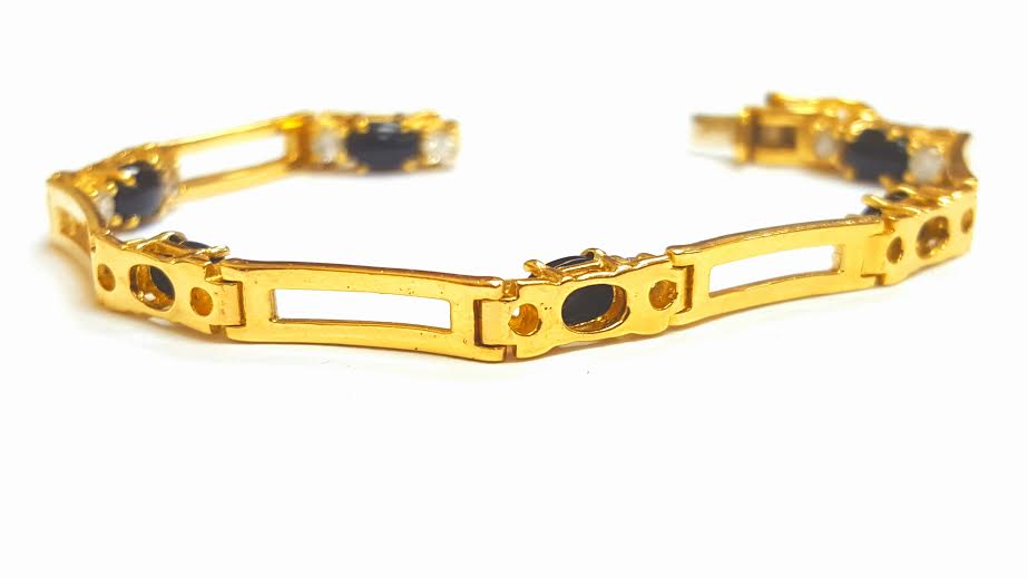 14k solid Yellow Gold Bracelet with Black Onyx Stones and 0.70ct Diamonds,6 Inch Gemstone Type - Natural Diamonds and Black Onyx Total Carat Weight - 0.70 carat (approx) Diamond Color - F-G Diamond Clarity - I1 Stone Quantity - 12 diamond 6 Black Onyx Metal Purity - Solid 14K Yellow Metal Weight - 9.6gr Bracelet length 6 Inch