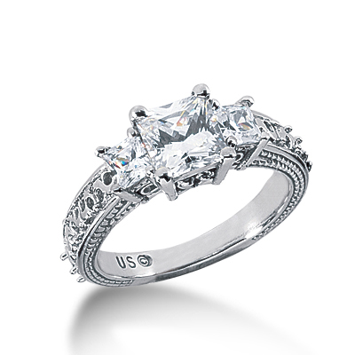 14K White Gold Three Stone Engagement Ring Setting up to 1.35ct Princess Cut