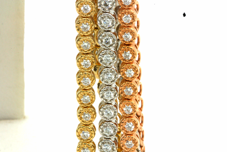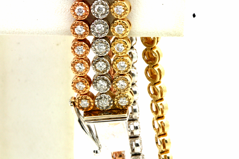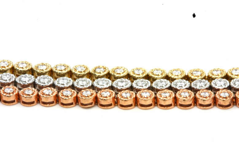 F VS 2.85ct 14K Pink White Yellow Gold Diamond Bracelet Gemstone Type - diamonds Total Carat Weight - 2.85 carat Diamond Color - F-G Diamond Clarity - VS Stone Quantity - 159 stones Metal Purity - Solid 14K Pink, White, Yellow Metal Weight - 22.5gr